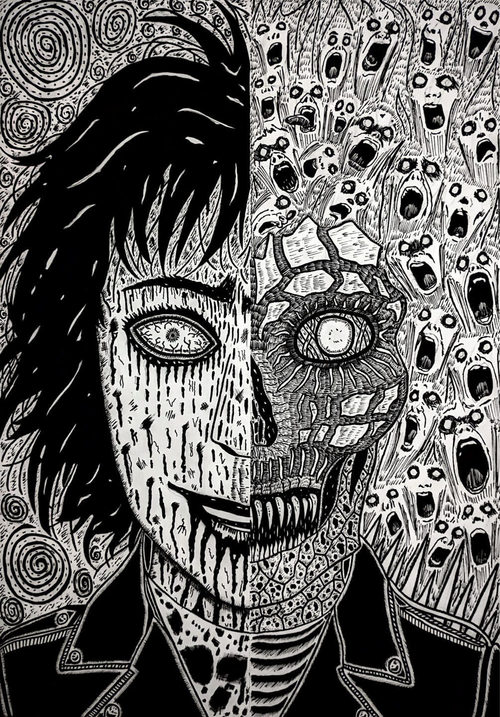 I am a huge fan of horror in all sorts of media and my main inspirations for this horror artwork is the legendary manga artist Junji Ito, so I redesigned an already established superhero in his style.